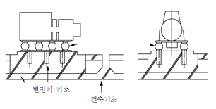 (2) 발전기 기초는 철근콘크리트로 구축하고 건축구조와 독립된 구조(독립기초 또는 부동기초)가 바람직하다. 다만, 건축과 같은 구조에 설치될 경우는 방진공법으로 한다.